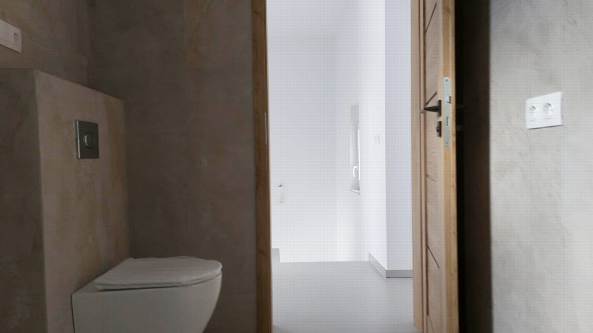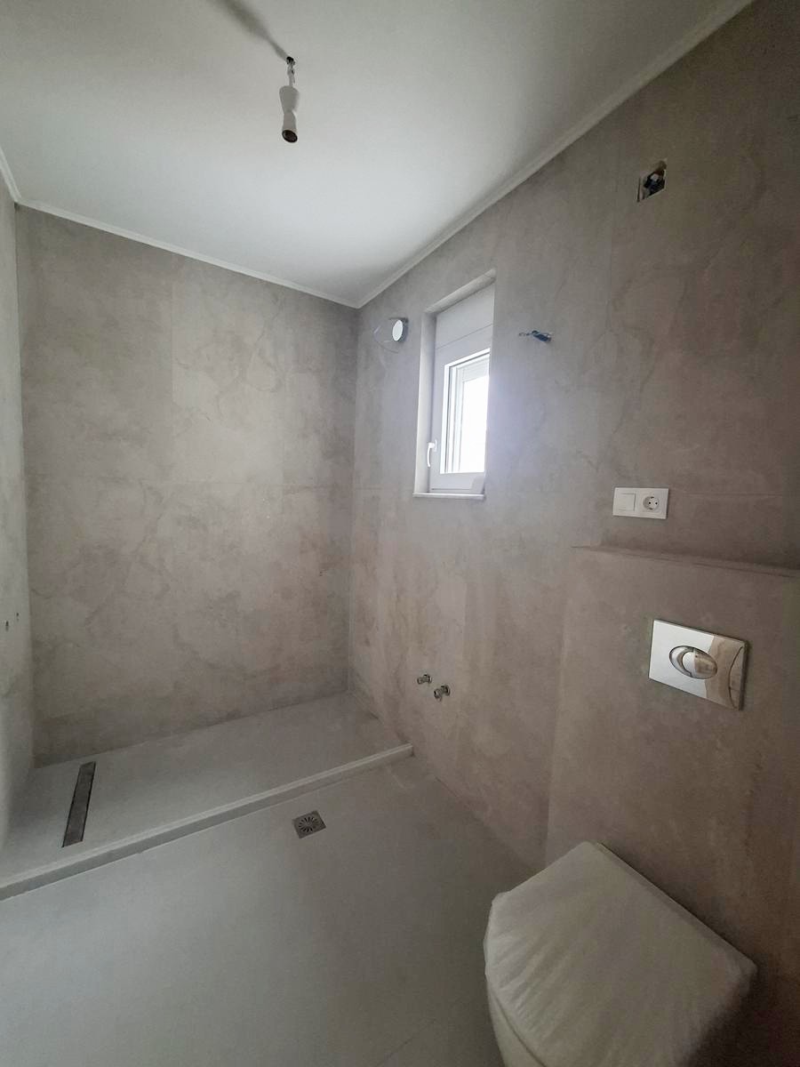 On the ground floor there is a modern kitchen in the open plan with a spacious living space. This level also offers a bathroom with a shower and storage for a washing machine. From the kitchen there is access to a covered terrace and garden.