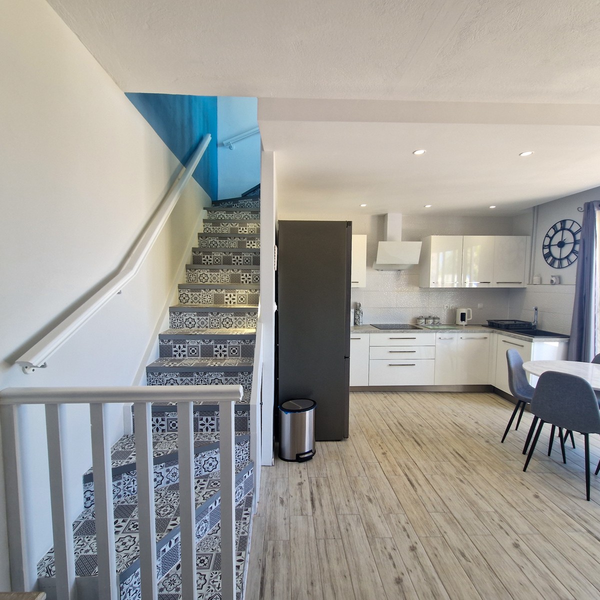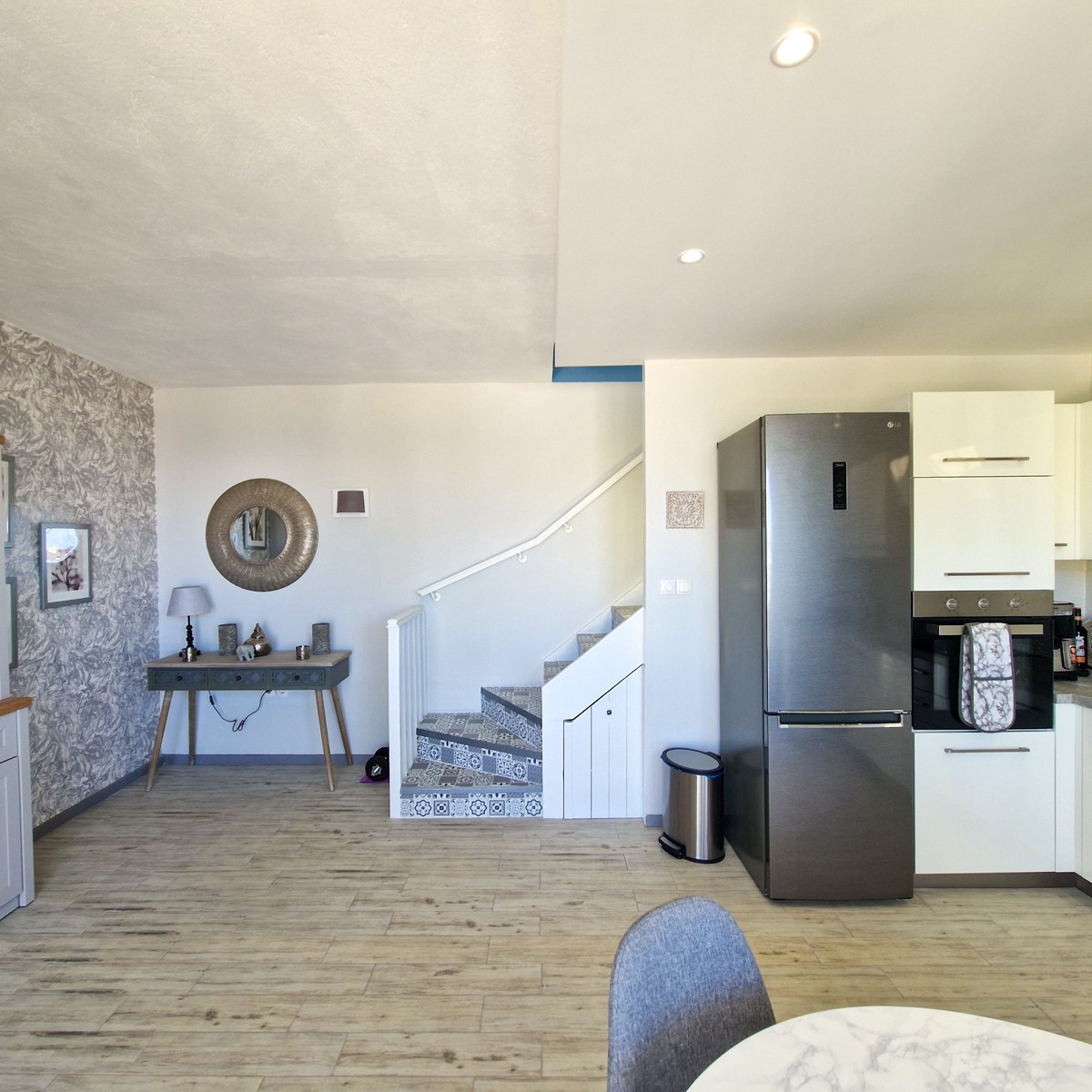 An internal staircase goes down to the lower level where the kitchen and dining area are located. The kitchen is fully fitted with white cabinets. Large balcony doors open out onto a spacious lower terrace. An outside separate WC is adjacent to the kitchen.
